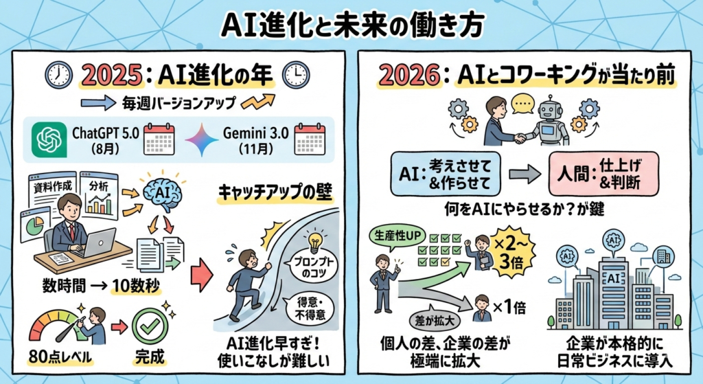 振り返ると2025年は、まさに「AI進化の年」でした。毎週のように、生成AI各社からサービスのバージョンアップが発表され、8月にはChatGPT5.0、11月にはGemini3.0がリリースされました。特にGemini3.0の能力向上は凄まじく、↑の画像(ポンチ絵)は、Gemini3.0(nano banana pro)によって15秒で生成されたものです。