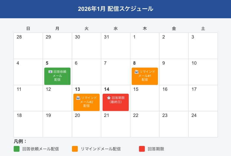 こちらのスケジュール表の通り、2026年1月の回答依頼メールの配信は、お正月休み明けの1月5日(月)9:00を予定しています。リマインドメール、回答期限はいつも通りです。