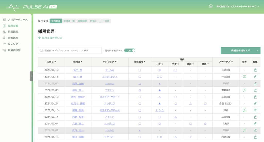 人材データベース機能と同じタイミングで、採用支援機能をリニューアルリリースいたしました。採用支援機能では、候補者情報の管理、採用プロセスの可視化、面接設定と面接依頼、面接結果の管理、評価シートの作成と回答データの集計分析、ポジション情報の管理など採用業務全般の管理を行えます。
