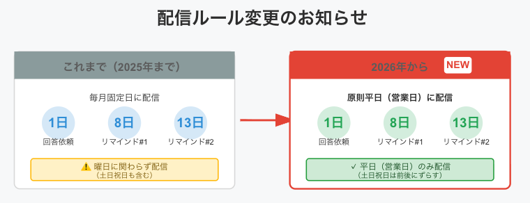今まで、回答依頼メール&リマインドメールは、曜日に関わらず、毎月1日・8日・13日としておりましたが、2026年から、各種メールの配信は原則平日(営業日)の配信へと変更させていただきます。1日・8日・13日が土日祝日と重なる場合は、前後の平日(営業日)へと配信日をずらします。