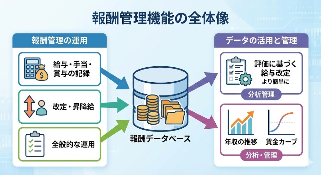 報酬管理機能では、社員(従業員)の給与、手当、賞与の記録・改定(昇降給)など報酬管理の全般的な運用を行えます。社員の報酬データをデータベースに蓄積することができ、毎年の評価に基づく給与改定をより簡単に行うことができるようになります。また、年収の推移や賃金カーブなどの管理を行うことができるようにもなります。